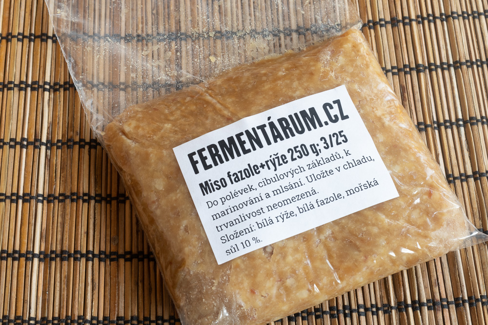 - čerstvé krátce zrající béžové miso naložené v břenu 2025 z malých bílých fazolí a bílé rýže s mořskou solí, bez extravagantních chuťových či aromatických výstřelků, vyvážené co do slanosti, acidity a umami, textura hustá a lepivá, polohrubě mletá, 250 g